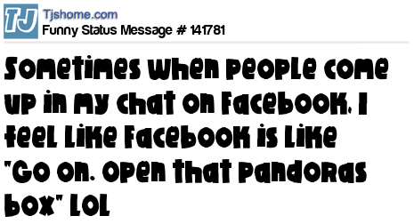 X says Sometimes when people come up in my chat on Facebook, I feel like Facebook is like "Go on. Open that pandoras box" LOL