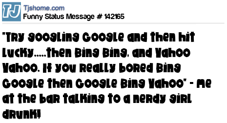 X "Try googling Google and then hit lucky.....then Bing Bing, and Yahoo Yahoo. If you really bored Bing Google then Google Bing Yahoo" - me at the bar talking to a nerdy girl drunk!