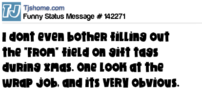 X I dont even bother filling out the "From" field on gift tags during xmas. One look at the wrap job, and its VERY obvious.