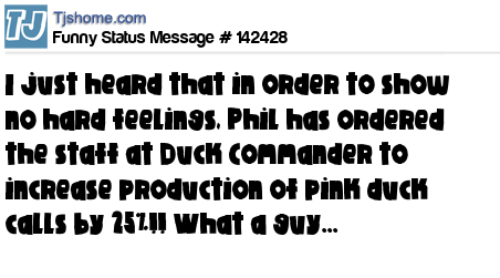 X says I just heard that in order to show no hard feelings, Phil has ordered the staff at Duck Commander to increase production of pink duck calls by 25%!! What a guy...