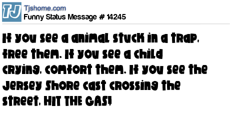 - # 14249 If you see a animal stuck in a trap, free them. If you see a child crying, comfort them. If you see the Jersey Shore cast crossing the street, HIT THE GAS! **DISCLAIMER** IF YOU ARE THE OWNER OF A TOYOTA IT IS NOT RECOMMENDED THAT YOU HIT THE GAS. DOING