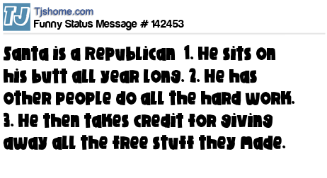 X says Santa is a Republican 1. He sits on his butt all year long. 2. He has other people do all the hard work. 3. He then takes credit for giving away all the free stuff they made.