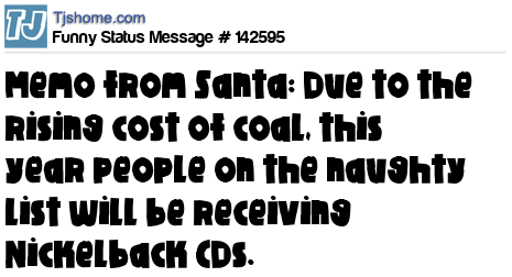 X Memo from Santa: Due to the rising cost of coal, this year people on the naughty list will be receiving Nickelback CDs.