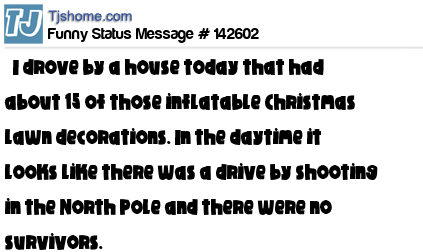 - # 39692 I drove by a house today that had about 15 of those inflatable Christmas lawn decorations. In the daytime it looks like there was a drive by shooting in the North Pole and there were no survivors.