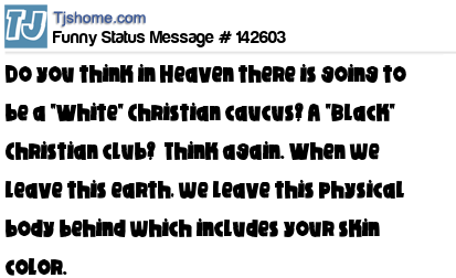 X says Do you think in Heaven there is going to be a "White" Christian caucus? A "Black" Christian club? Think again. When we leave this earth, we leave this physical body behind which includes your skin color.
