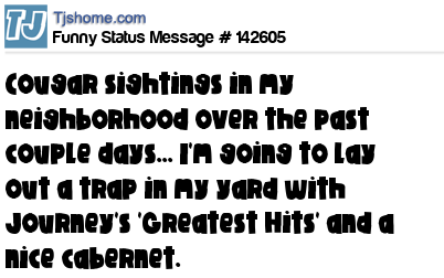 X Cougar sightings in my neighborhood over the past couple days... I'm going to lay out a trap in my yard with Journey's 'Greatest Hits' and a nice cabernet.