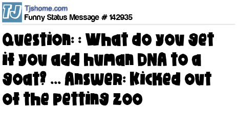 X Question: : What do you get if you add human DNA to a goat? ... Answer: Kicked out of the petting zoo