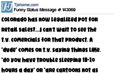 X says Colorado has now legalized pot for retail sales?....I can't wait to see the t.v. comercials for that product. A "dude" comes on t.v. saying things like. "do you have trouble sleeping 18-20 hours a day" or "are cartoons not as funny now as they were when y