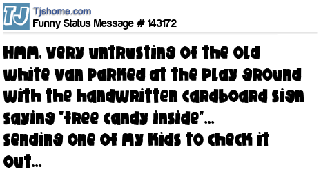 X says Hmm, very untrusting of the old white van parked at the play ground with the handwritten cardboard sign saying "free candy inside"... sending one of my kids to check it out...