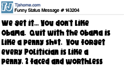 X says We get it... You don't like Obama. Quit with the Obama is like a penny sh#t. You forget every Politician is like a penny, 2 faced and worthless