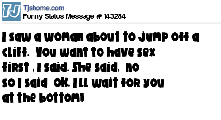 X I saw a woman about to jump off a cliff. “You want to have sex first”, I said. She said, “no” so I said “OK, I’ll wait for you at the bottom!”