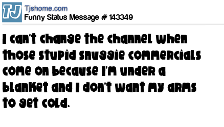 X I can't change the channel when those stupid snuggie commercials come on because I'm under a blanket and I don't want my arms to get cold.