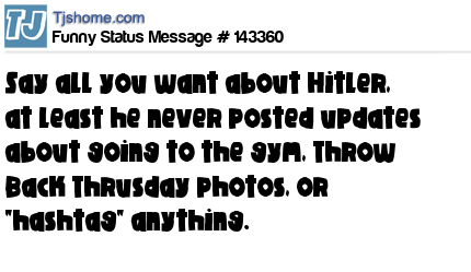 X says Say all you want about Hitler, at least he never posted updates about going to the gym, Throw Back Thrusday photos, or "hashtag" anything.