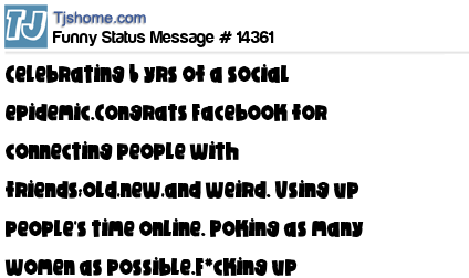 X is Celebrating 6 yrs of a social epidemic.Congrats Facebook for connecting people with friends;old,new,and weird. Using up people's time online. Poking as many women as possible.F*cking up relationships/marriages,and checking up on people's exaggerated lives