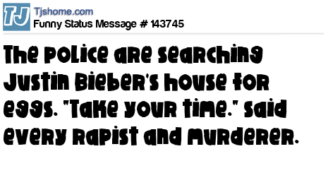 X says The police are searching Justin Bieber's house for eggs. "Take your time." said every rapist and murderer.