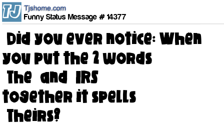 - # 121484 As income tax time approaches, did you ever notice that when you put the two words, 'The' and 'IRS' together, it spells THEIRS?