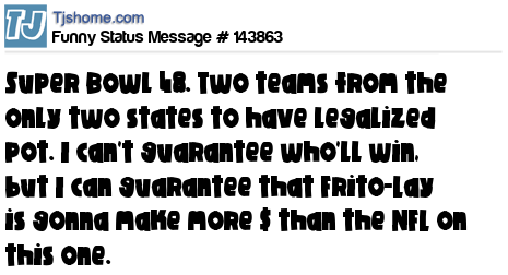 X Super Bowl 48. Two teams from the only two states to have legalized pot. I can't guarantee who'll win, but I can guarantee that Frito-Lay is gonna make more $ than the NFL on this one.