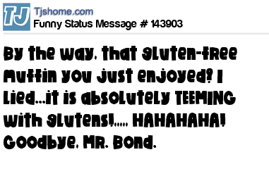 X By the way, that gluten-free muffin you just enjoyed? I lied...it is absolutely TEEMING with glutens!,,,,, HAHAHAHA! Goodbye, Mr. Bond.