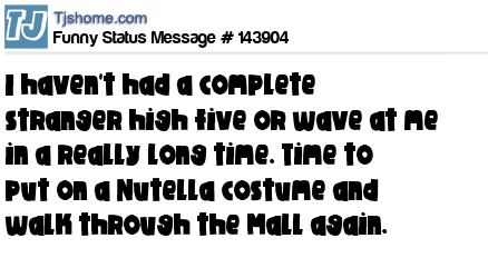 X I haven't had a complete stranger high five or wave at me in a really long time. Time to put on a Nutella costume and walk through the Mall again.