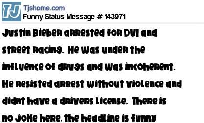 X says Justin Bieber arrested for DUI and street racing. He was under the influence of drugs and was incoherent. He resisted arrest without violence and didnt have a drivers license. There is no joke here, the headline is funny enough on its own merit.