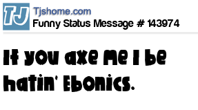 - # 201317 Does the ebonics alphabet contain the letter "D"? All I hear is, "My mom an' Dat." "I'm ok, I'm goot." "I like Chevy but I also like Fort."