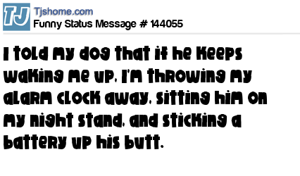 X I told my dog that if he keeps waking me up, I'm throwing my alarm clock away, sitting him on my night stand, and sticking a battery up his butt.