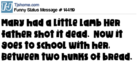 X says Mary had a little lamb Her father shot it dead. Now it goes to school with her, Between two hunks of bread.