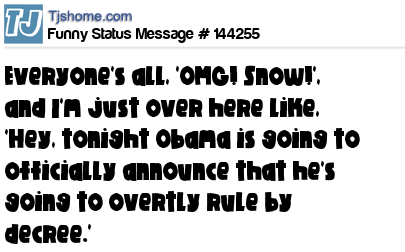 X says Everyone's all, 'OMG! Snow!', and I'm just over here like, 'Hey, tonight Obama is going to officially announce that he's going to overtly rule by decree.'