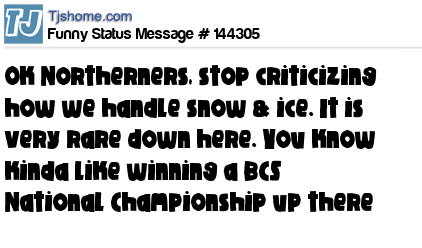 X says Ok Northerners, stop criticizing how we handle snow & ice. It is very rare down here. You know kinda like winning a BCS National Championship up there