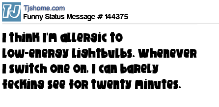 X says I think I'm allergic to low-energy lightbulbs. Whenever I switch one on, I can barely fecking see for twenty minutes.