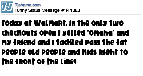 X Today at Walmart, in the only two checkouts open I yelled "Omaha" and my friend and I tackled pass the fat people old people and kids right to the front of the line!