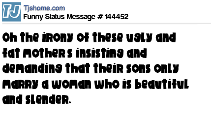 X says Oh the irony of these ugly and fat mother’s insisting and demanding that their sons only marry a woman who is beautiful and slender.