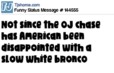 - # 150090 20 years ago today the famous OJ Simpson white Bronco chase. As you know he would later be found not guilty in a Calafornia court of murder...Ironically.... He wakes up this morning in JAIL !!! Gotta love Karma!!!