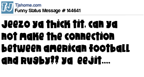 X says jeezo ya thick tit, can ya not make the connection between american football and rugby?? ya eejit....