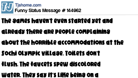 X says The games haven't even started yet and already there are people complaining about the horrible accommodations at the Sochi Olympic village. Toilets don't flush. The faucets spew discolored water. They say it's like being on a Royal Caribbean cruise.