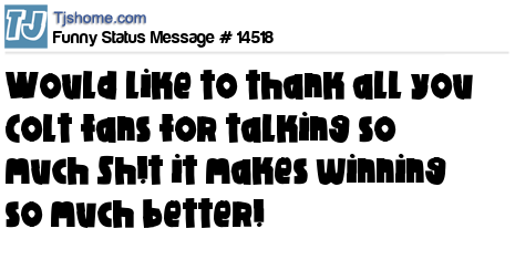 X Would like to thank all you Colt fans for talking so much Sh!t it makes winning so much better!
