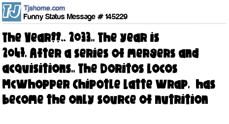 X The Year??.. 2033,, The year is 2047, After a series of mergers and acquisitions,, The Doritos Locos McWhopper Chipotle Latte Wrap, has become the only source of nutrition
