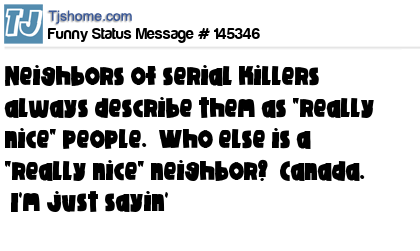 X says Neighbors of serial killers always describe them as "really nice" people. Who else is a "really nice" neighbor? Canada. I'm just sayin'