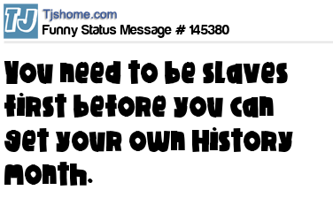 - # 45124 Celebrating Black History Month. I got my baggy FUBU jeans on with the chicken pouch... I hope my month is full of drive bys, gangster rap, 40 ozers, drug deals, watermelon and lots of fried chicken.... Happy Black History Month!!!!!!!