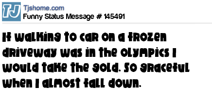 X says If walking to car on a frozen driveway was in the olympics I would take the gold. So graceful when I almost fall down.