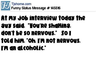 X says At my job interview today the guy said, "You're shaking, don't be so nervous." So I told him, "Oh, I'm not nervous, I'm an alcoholic."