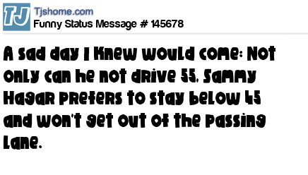 X says A sad day I knew would come: Not only can he not drive 55, Sammy Hagar prefers to stay below 45 and won't get out of the passing lane.