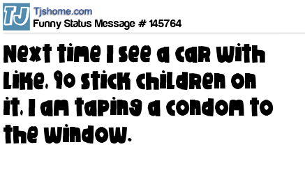 - # 156608 Next time I see a car with like, 90 stick children on it,I am taping a condom to the window.