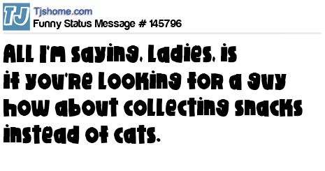 X says All I'm saying, ladies, is if you're looking for a guy how about collecting snacks instead of cats.