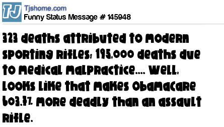 X says 323 deaths attributed to modern sporting rifles; 195,000 deaths due to medical malpractice.... Well, looks like that makes ObamaCare 603.7% more deadly than an assault rifle.