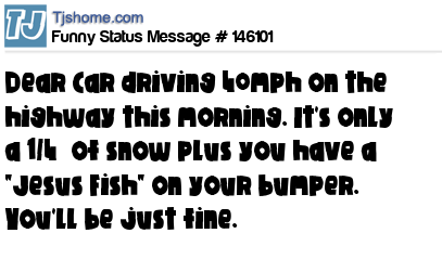 X Dear Car driving 40mph on the highway this morning. It's only a 1/4“ of snow plus you have a "Jesus Fish" on your bumper. You'll be just fine.