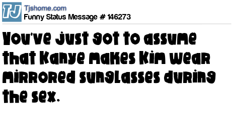 X says You've just got to assume that Kanye makes Kim wear mirrored sunglasses during the sex.