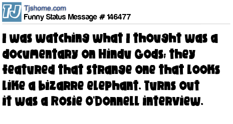 X I was watching what I thought was a documentary on Hindu Gods; they featured that strange one that looks like a bizarre elephant. Turns out it was a Rosie O'Donnell interview.