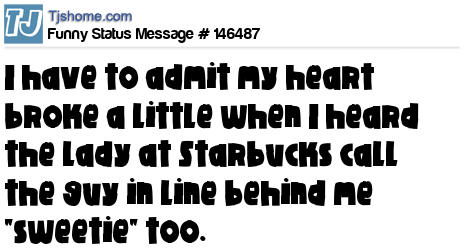 X says I have to admit my heart broke a little when I heard the lady at Starbucks call the guy in line behind me "sweetie" too.