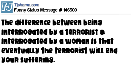 X says The difference between being interrogated by a terrorist & interrogated by a woman is that eventually the terrorist will end your suffering.